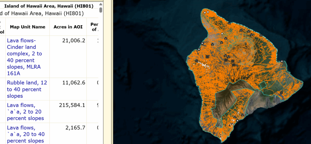The website is easy to navigate, after you have identified your Area of Interest, the other tabs allow you to explore soil data. One of the neat things I found about Hawaii was the lava flow